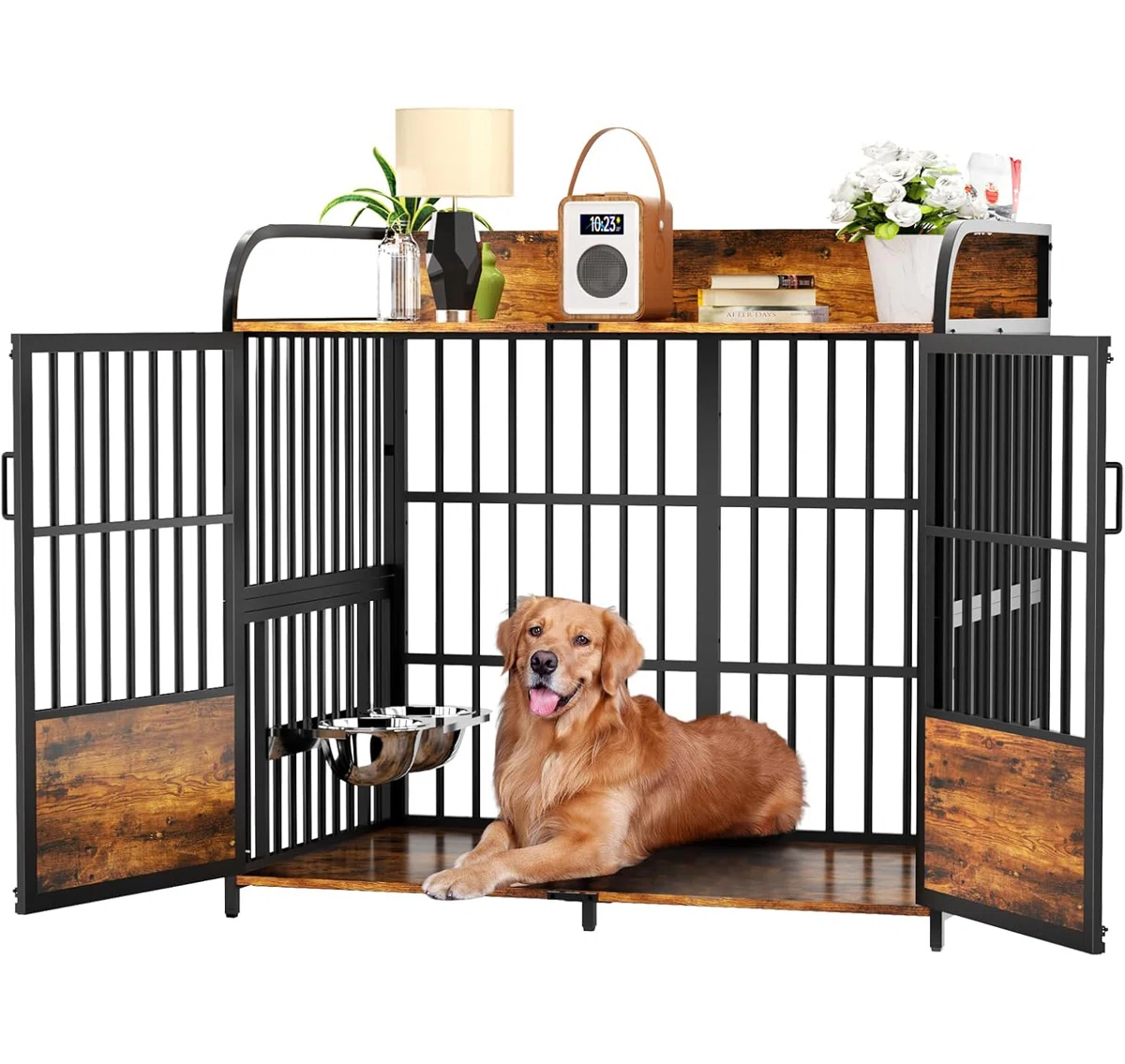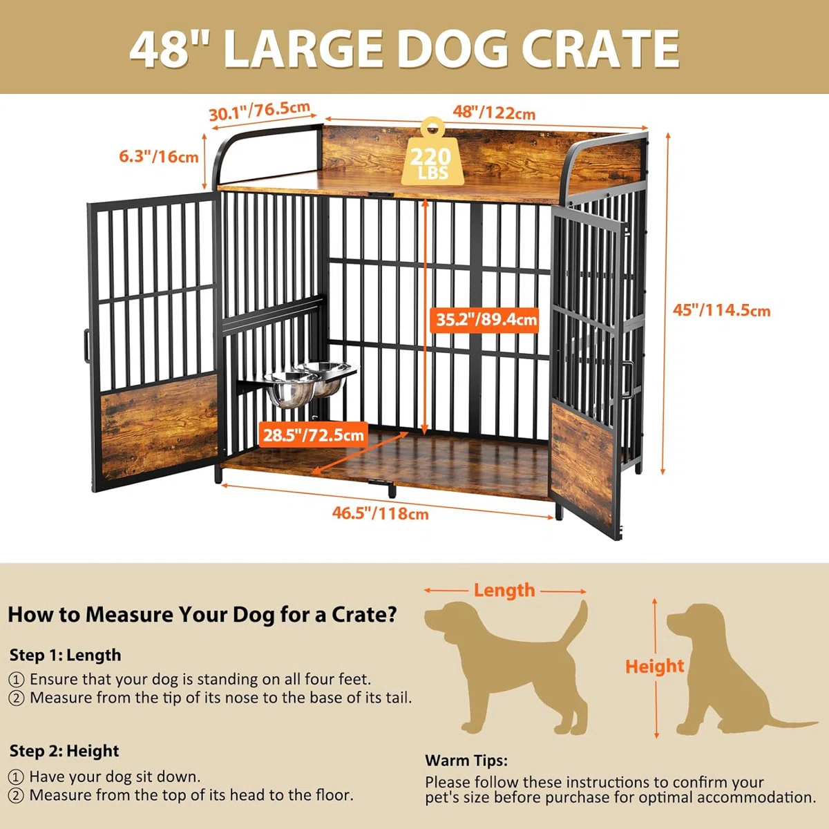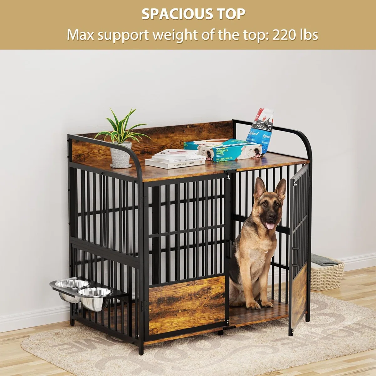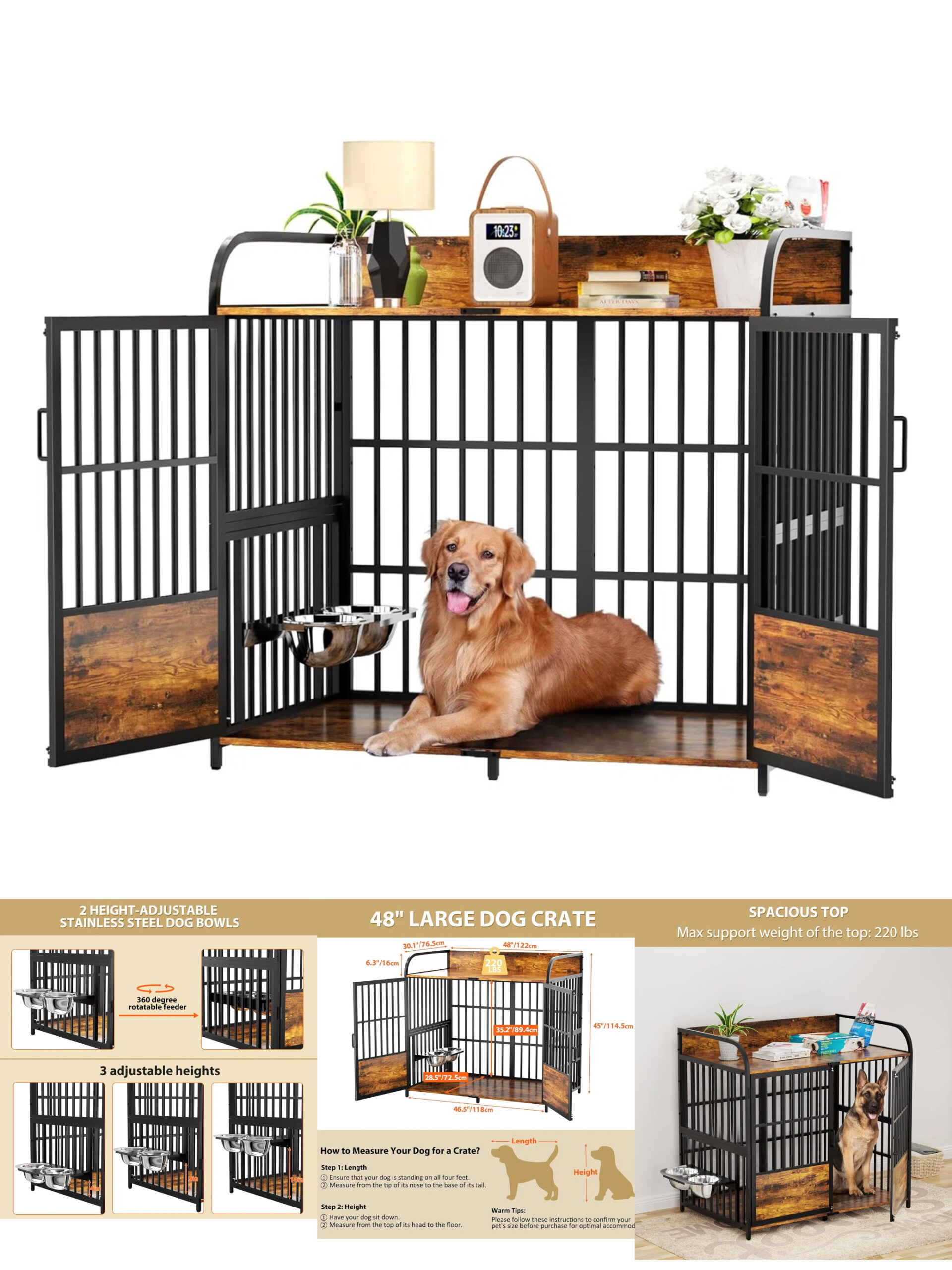 48 in Dog Crate Furniture, Medium Dog Kennel Indoor with Adjustable Bowls, Wooden Dog Cage Table Decorative for Small, Medium, Dog, Brown